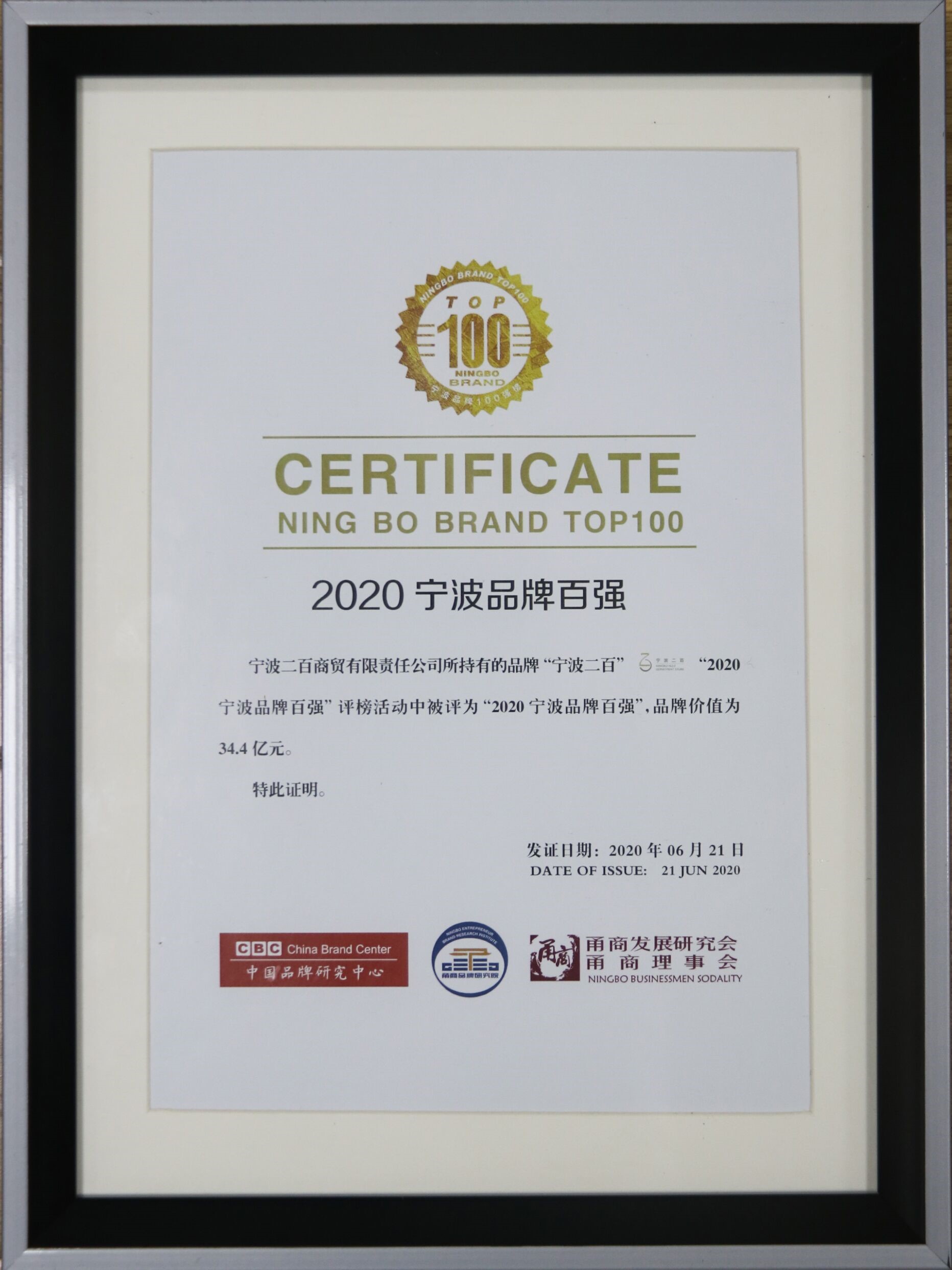 6月21日下午,在由“中國品牌研究中心”、“甬商發(fā)展研究會”、“甬商聯合會”聯合舉辦的“2020寧波品牌”授牌儀式上,我公司被授予“2020抗擊疫情寧波品牌”,寧波二百(公司全資子公司)被授予“2020寧波品牌百強”(二百品牌價值為34.4億元)!